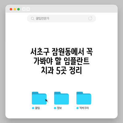 서초구 잠원동에서의 임플란트 치료는 여러 가지 선택지와 정보를 바탕으로 신중하게 결정해야 하는 과정입니다. 성공적인 임플란트 시술을 위해서는 가격, 후기, 치과의 신뢰성과 같은 요소를 꼼꼼히 살펴보아야 해요. 여러분의 건강한 미소를 위한 첫걸음은 바로 적합한 치과를 선택하는 것입니다. 좋은 치과를 통해 최상의 치료를 받으시길 바랍니다!